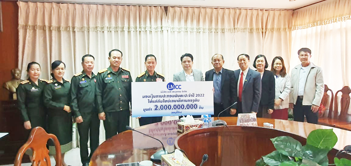 ບໍລິສັດ ເບສ ເທເລຄອມ ຈຳກັດ ມອບເງິນປະກອບພັນທະ ປີ 2022 ໃຫ້ແກ່ກົມໃຫຍ່ເສນາທິການກອງທັບ ກະຊວງປ້ອງກັນປະເທດ ຈຳນວນ 2 ຕື້ກີບ ໂດຍເປັນກຽດມອບໂດຍ ທ່ານ ປອ ລິດທິກອນ ພູມມະສັກ ຫົວໜ້າອຳນວຍການໃຫຍ່ ບໍລິສັດ ເບສເທເລຄອມ ຈຳກັດ.